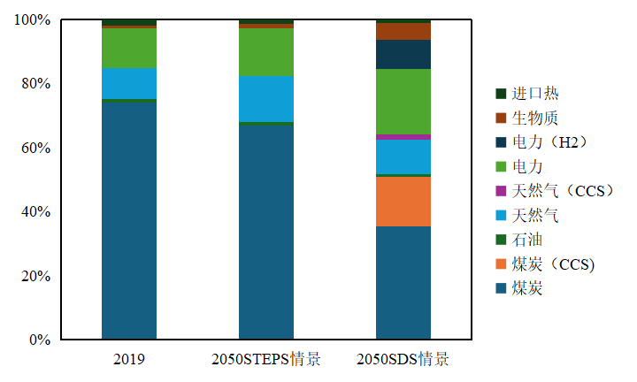 钢铁生产的能源利用效率对其CO2排放有直接影响,提升能效水平是未来十年内钢铁工业节能减排的重点。目前,各钢铁企业面临着巨大的节能、降碳、减排压力。而根据我国资源条件,尽快提高钢铁企业能源利用效率,并改变国内钢铁工业的原料结构和流程结构,如使用大比例球团矿、增加废钢的用量和提升电炉炼钢流程比例等,才是实现节能减排迫在眉睫的发展目标和实现碳达峰、碳中和的有力保障。钢铁工业应该从根本上改善能源消费结构,减少煤炭消耗,提升可再生能源利用技术,实现能源结构低碳化发展,从源头解决以煤炭为主要能源结构所导致的碳排放问题。国际能源署(IEA)对钢铁行业的能源结构做出预测,如图1所示。能源管控系统是国家工信部推出的节能先进适用技术之一,也是企业实现能源精细化管理的重要措施。对智慧能源系统进行进一步开发,大力发展智能制造,是提升能效的重要抓手,也是实现钢铁工业绿色化智能化发展的重要手段。