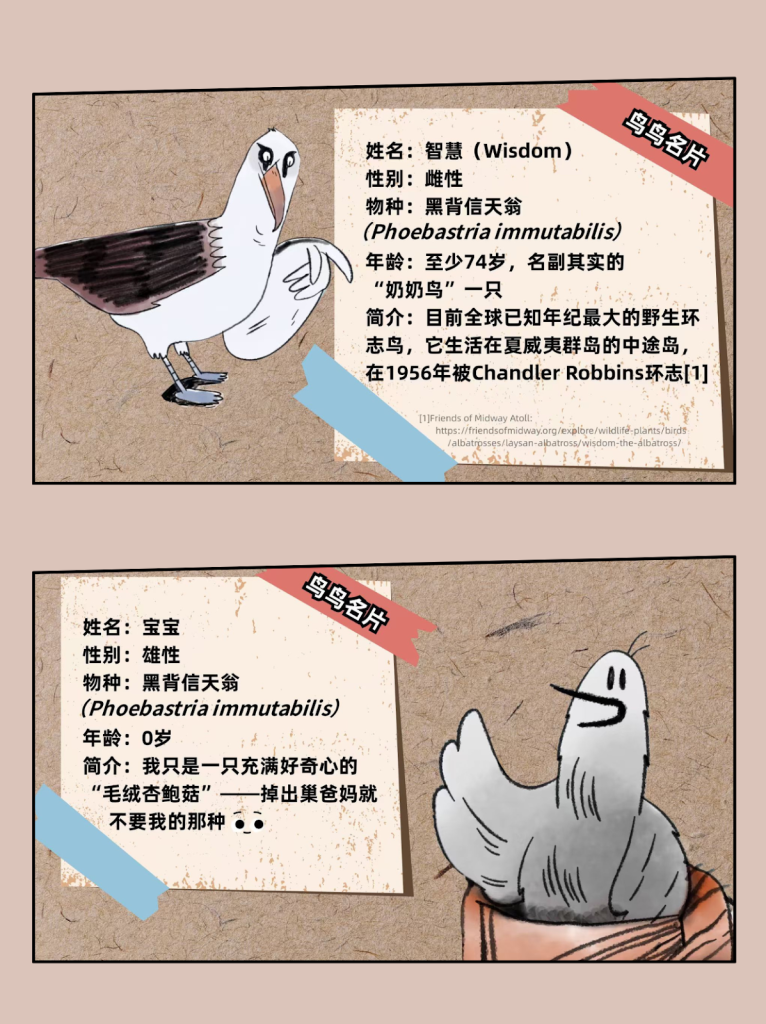 11月21日是世界渔业日(World Fisheries Day),是一个呼吁更多人关注可持续渔业发展,强调海洋健康对全球食物安全、生计保障以及人类未来的重要性的日子。在这个特别的日子里,我们迎来了一对特殊的客人——一老一小两只黑背信天翁。雌性黑背信天翁“智慧”是目前全球已知年纪最大的野生环志鸟,今年74岁高龄的她依旧生活在在西北夏威夷群岛附近,翱翔在太平洋上空。“智慧”这次要给小信天翁带来什么故事呢?让我们一同来了解一下吧!