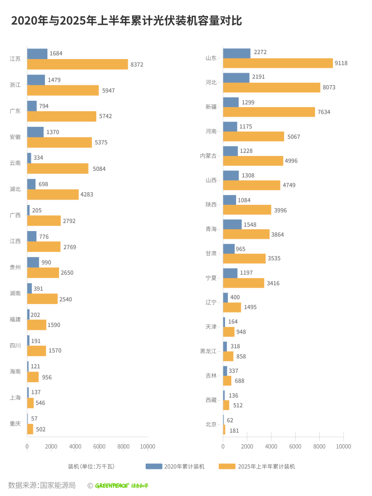 “十四五”期间,可再生能源装机规模取得了历史性突破。截至2025年9月底,全国发电装机总容量达37.2亿千瓦,其中可再生能源占比达到59.1%[2]。2025年第一季度,风电与光伏发电总装机容量首次超过火电[3],标志着电力系统结构转型迈入新阶段。在新增装机方面,“十四五”以来结构优化成效显著:截至2025年7月底,全国新增装机总量的80%源自风光发电[4]。从省份层面看,与2020年相比,截至2025年6月所有省份光伏装机均实现翻倍增长,广西、云南等省份增幅更达十倍以上,充分反映出全国清洁能源发展的全面提速。