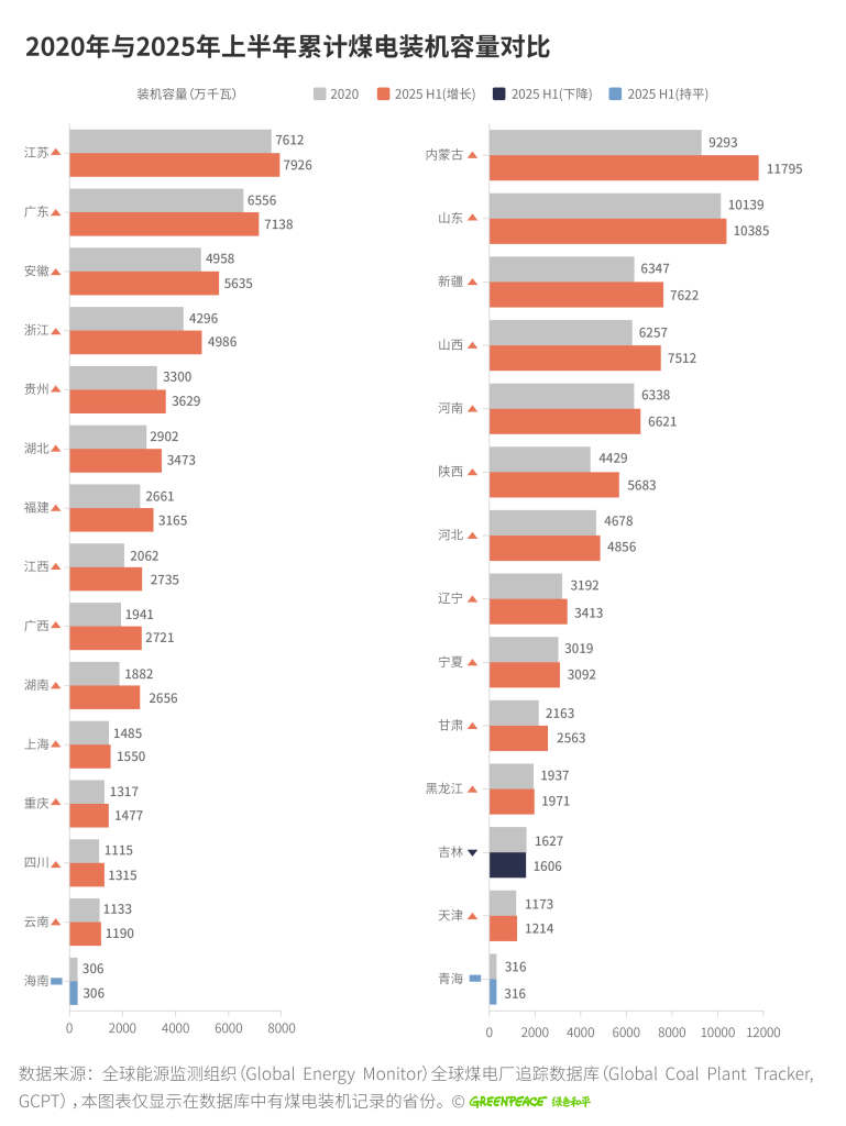 然而,在光伏装机快速扩张的同时,煤电装机亦呈增长态势。据全球能源监测组织(Global Energy Monitor, GEM)数据[5],2020年至2025年6月,全国仅吉林省煤电装机下降,其余省份均保持增长或持平。