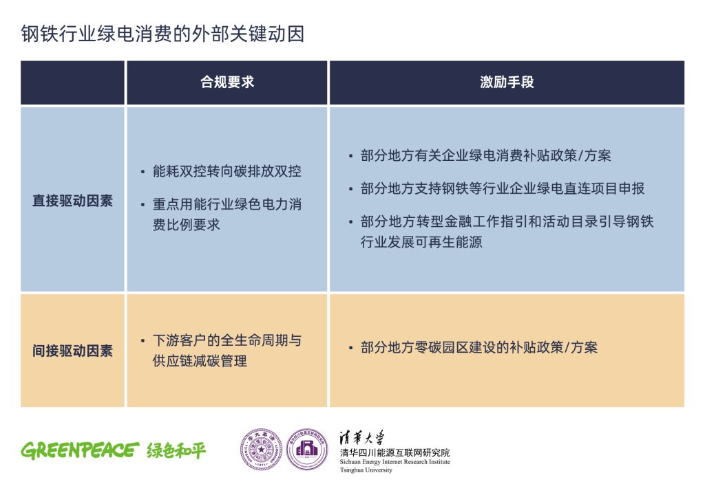 报告从直接与间接驱动因素,合规要求与激励手段多维度分析了当前钢铁行业开展绿电消费的外部关键动因。
