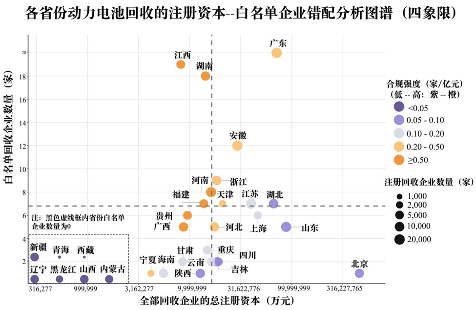 从全国格局看,动力电池回收产业已出现资本集聚与合规产能分布脱节的现象。根据合规强度(见图4)及企查查数据,各省从事动力电池回收业务企业的注册资本总量与白名单企业数量几乎没有相关性(相关系数为–0.03)。这意味着资本最密集的地区,并不一定具备更高比例的合规回收产能,即经工信部公告认定、具备回收拆解及再利用资质的白名单企业产能,从而进一步拉大了区域间的产业差距。