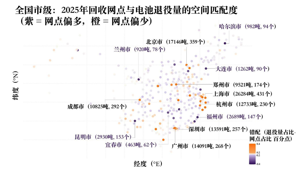以上海为例,该城市2025年的退役电池量占全国总量的6.7%,但网点份额仅为2.97%,退役电池产生量与回收网点供给之间比例失衡。相反,一些退役量较低的城市,如哈尔滨、福州、昆明等,却拥有更高的网点占比。这种失衡可能导致网点利用率低、竞争无序和资源浪费等情况,使得全国回收体系整体效率下降。