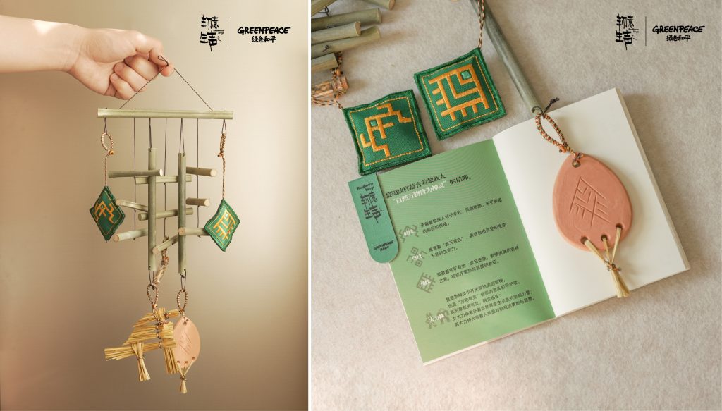 取材自青松乡的故事,绿色和平以当地自然和人文元素为灵感,设计出一款名为“韧意生声”的风铃和口袋本礼盒。