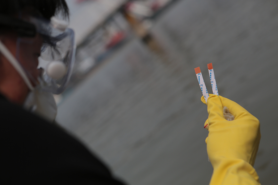 8月20日,绿色和平快速反应小组第二次奔赴天津,深入滨海新区5公里、3公里、1公里以内的爆炸点周边居民区七个点进行氰化物浓度快速检测。在天滨公寓周边、港滨公寓附近北段入海明渠及海河入海口发现微量氰化物污染。